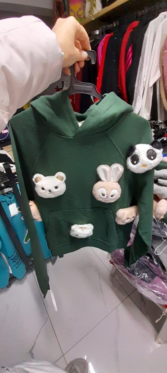 Koyu yeşil renkte, nakışlı hayvan figürleri ve kürk detaylı, sokak stili ithal ürünler her bedeni mevcuttur stok sorunuz s m l xl xxl
