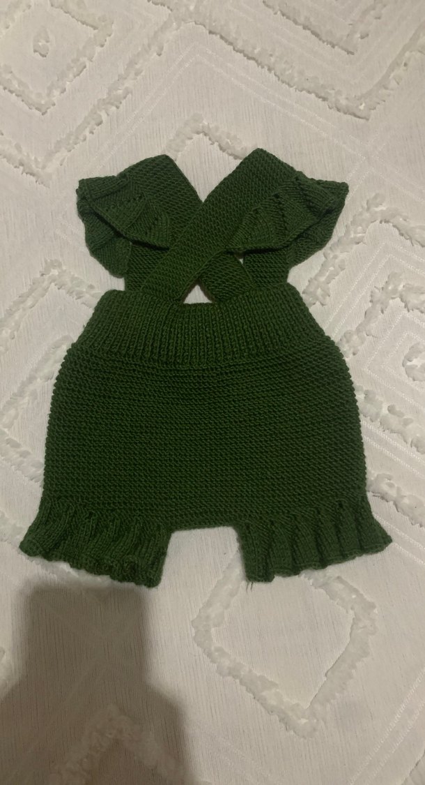 Koyu yeşil renkli, yumuşak dokulu örgü bebek kız tulumudur. Çapraz askıları ve paçalarda fırfır detayları bulunur. istenilen renkte sipariş alınabilir.