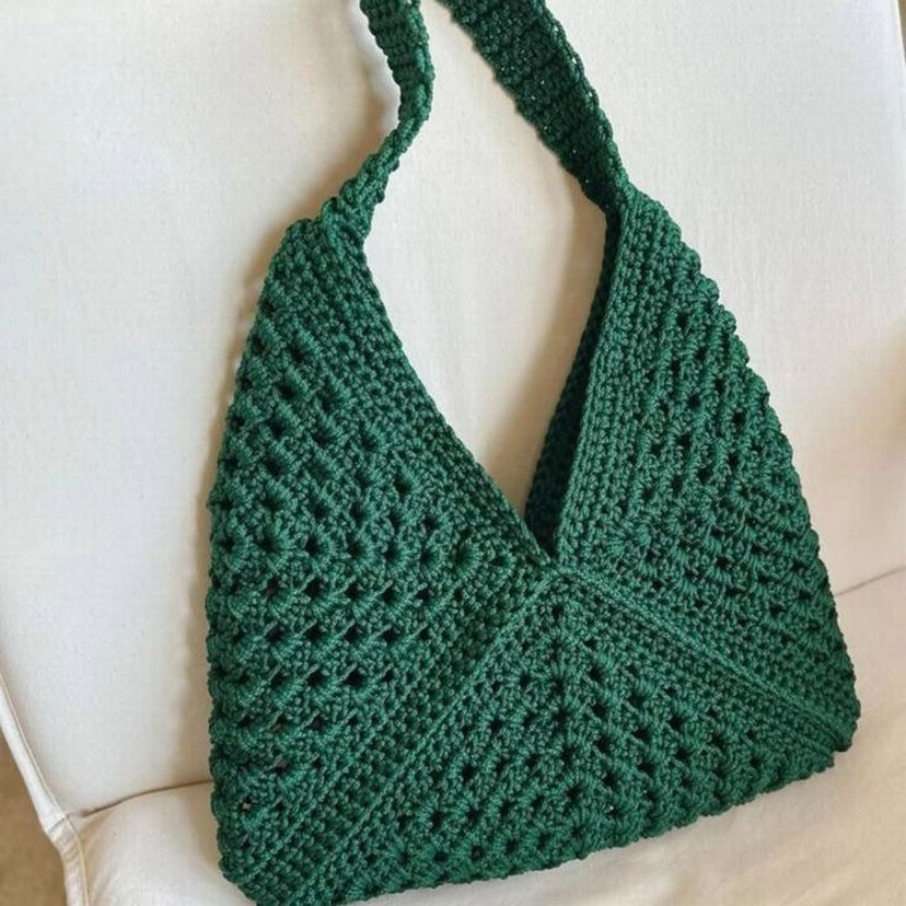 Koyu yeşil örgüden yapılmış, bohem tarzda ve sade desensiz kadın çantası. Günlük kullanıma uygun, el yapımı şık tasarım.