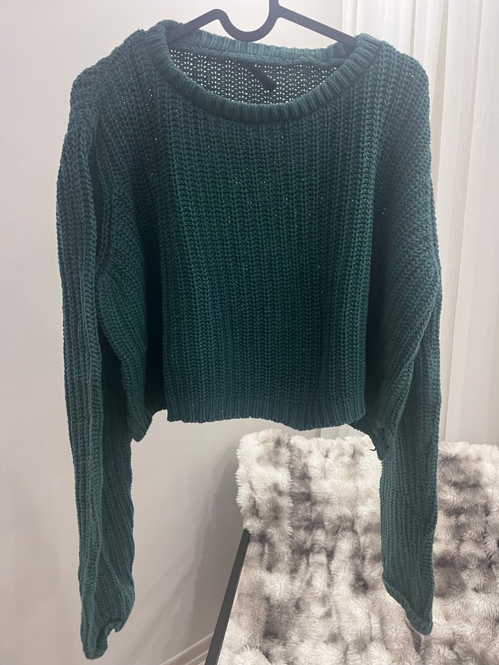 Koyu yeşil renkli, uzun kollu, yuvarlak yakalı örgü kadın triko kazak.