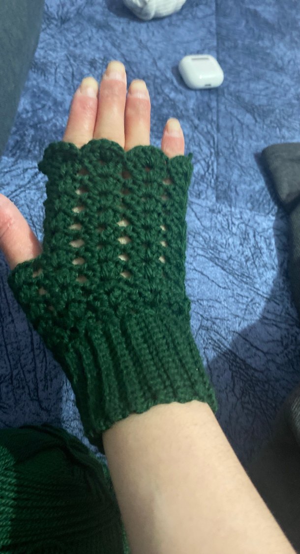 Yumuşak örgü kumaştan yapılmış, koyu yeşil renkli, parmak kısmı açık, bohem tarzda ve nostaljik görünümlü kadın eldiveni.