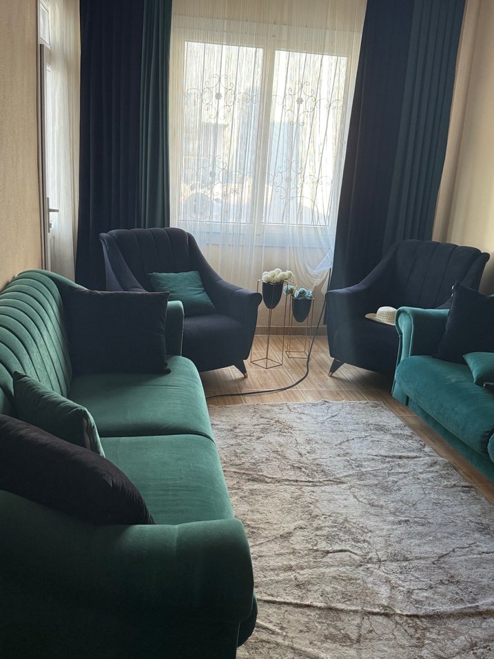 Koyu Yeşil Oturma Odası Takımı ve Perde