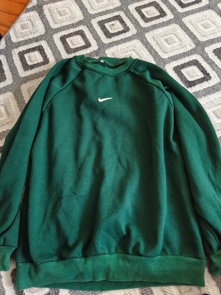 için koyu yeşil renkte, bisiklet yaka ve uzun kollu oversize sweatshirt. Yumuşak ve sıcak kumaştan üretilmiş, sade tasarımlı, göğsünde küçük beyaz logo bulunur.