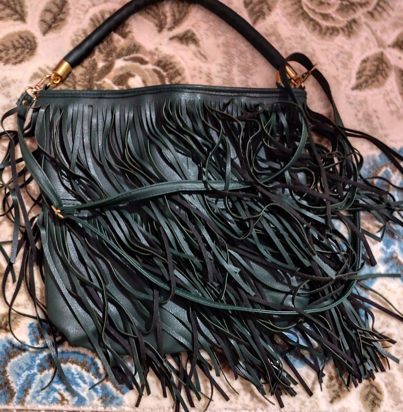 koyu yeşil deri, püsküllü ve desenli bohem tarzda, günlük kullanıma uygun kadın çantası. sorunu yoktur