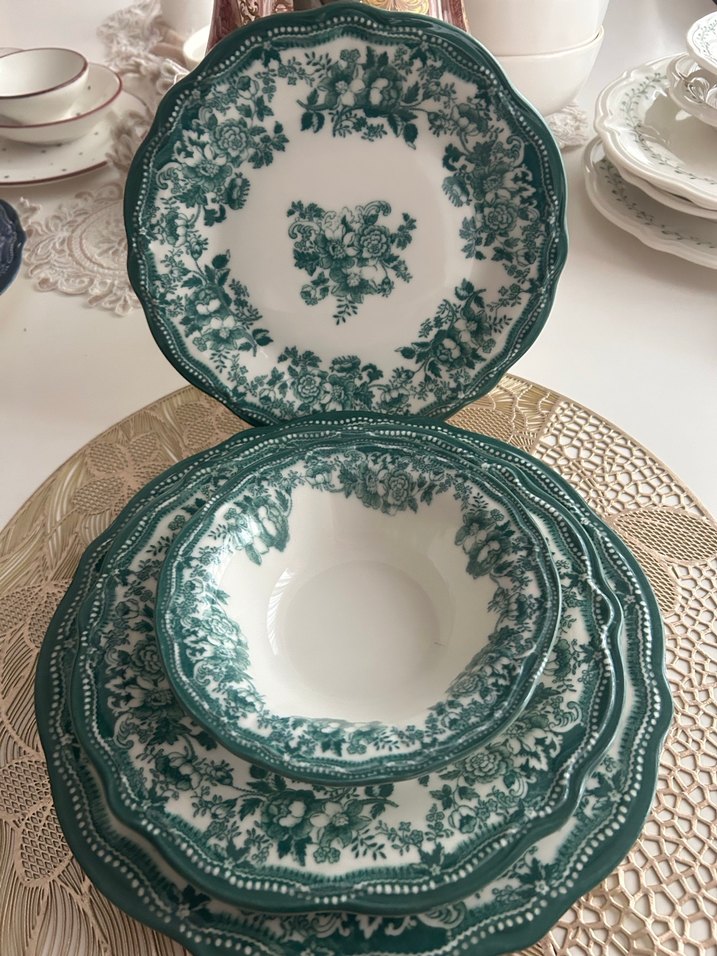 Koyu yeşil çiçek desenli, dalgalı kenarlı porselen 24 parça 6 kişilik yemek takımı:”sıfır üründür Çeyız için uygundur