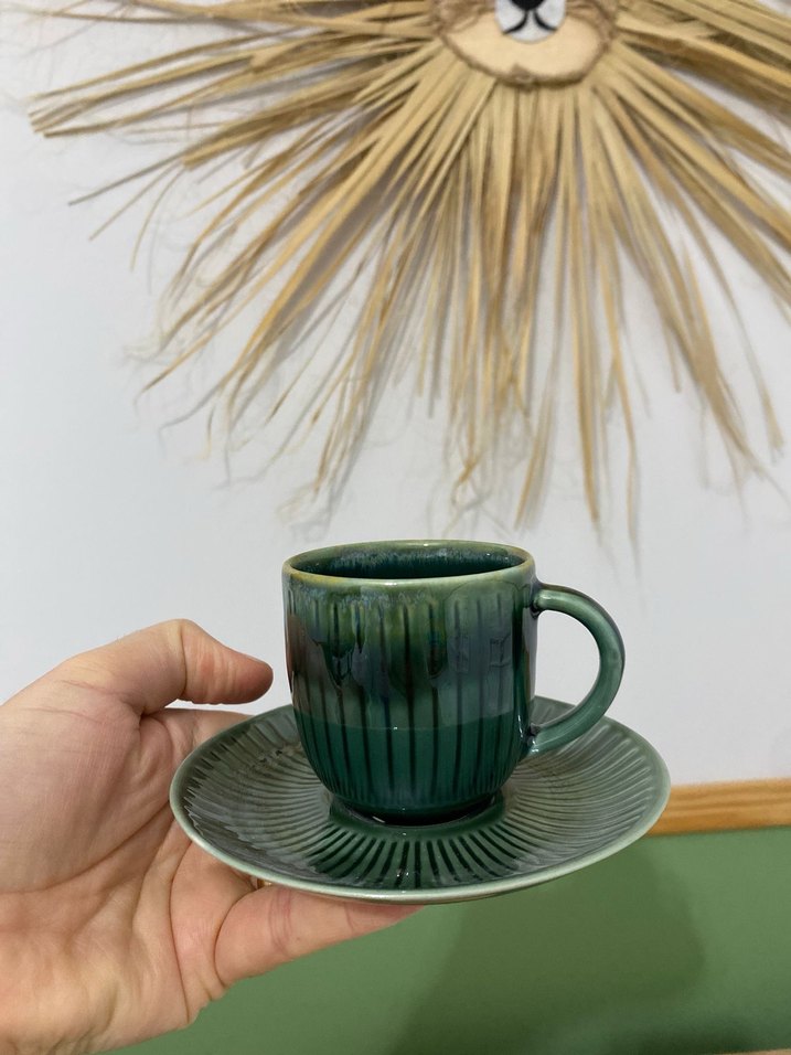 Koyu yeşil renkli, kabartmalı seramik fincan ve tabağıdır. Sıcak içecekler için uygundur. ☕