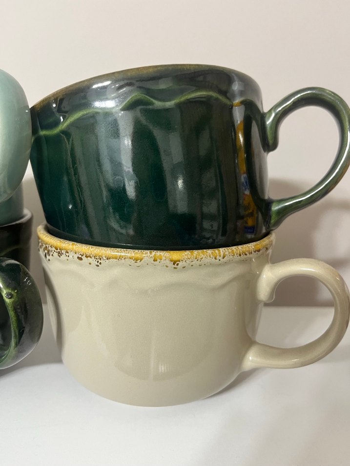 Koyu yeşil renkte, seramik malzemeden yapılmış, kulplu ve parlak yüzeyli bir kupa. ☕ tane fiyatı 250