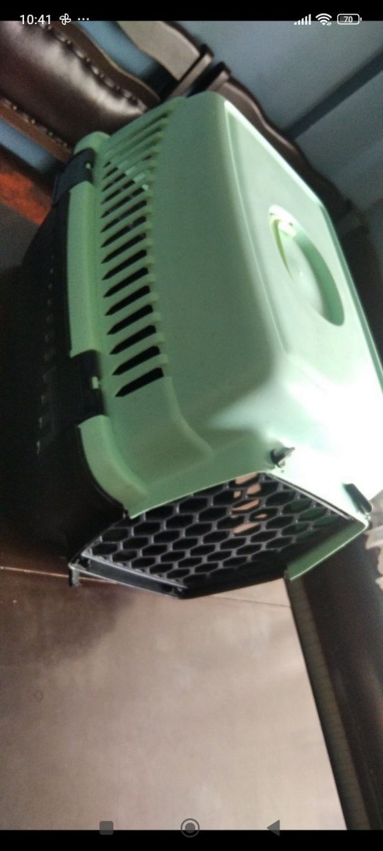 Koyu yeşil renkli taşıma ve tuvalet kabı, havalandırma delikleri ve güvenli ön kapıya sahiptir. Küçük evcil hayvanlar için uygundur.