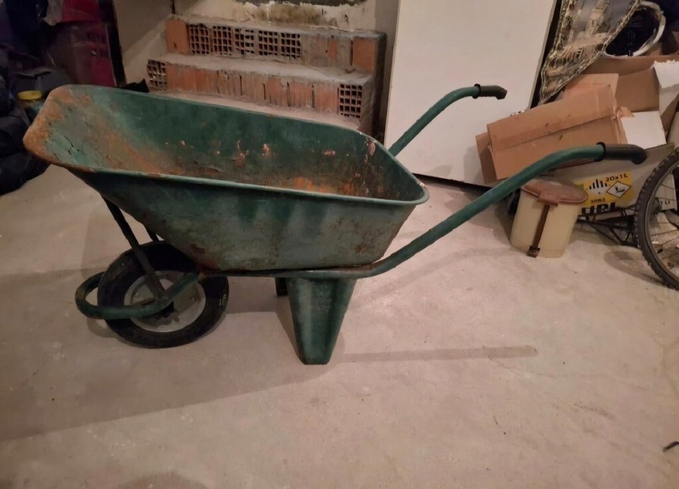 Koyu yeşil renkte, tek tekerlekli ve metal saplı el arabası, ağır yük taşımak için uygundur.