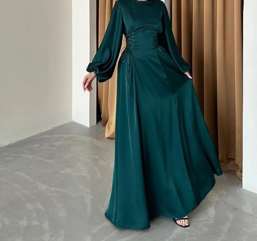 Koyu yeşil, yüksek yakalı ve bol kesimli uzun abiye elbise. Drapeli detaylar ve askılı kollarıyla düğünler için uygun, desensiz kumaş.