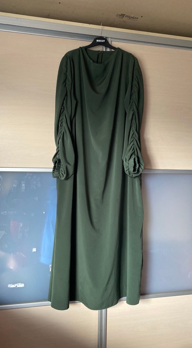 Koyu yeşil uzun elbise, yüksek yakalı ve drapeli uzun kollu tasarımıyla bol kesim ve sade bir görünüm sunar. Kolları büzgülü sade ve şık elbise