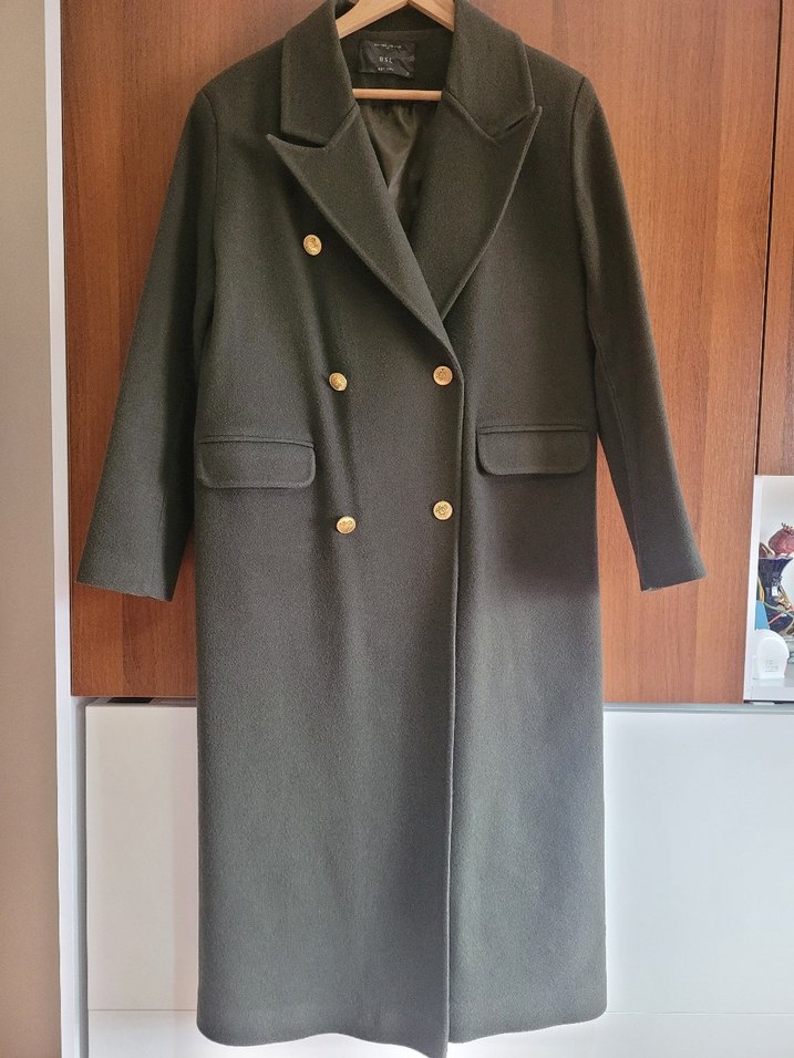 Uzun koyu yeşil kaban, çift sıra altın düğmeli ve ön cepli. sayılı giyildi, 78% yün kumaşı. uzunluk 118 cm, iki kol arası 50 cm. #bsl