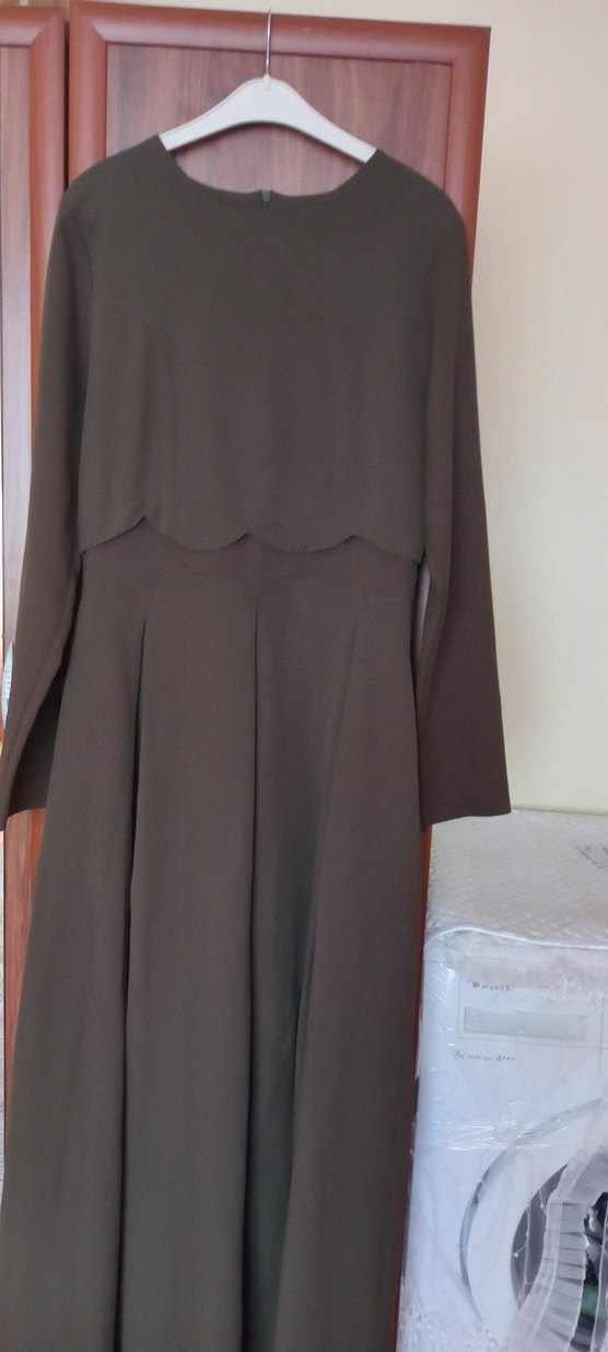 koyu yeşil renkli, uzun kollu ve drapeli tasarıma sahip bu uzun elbise, klasik ve modern tarzı bir araya getirir. Ofis için uygundur. yepyeni