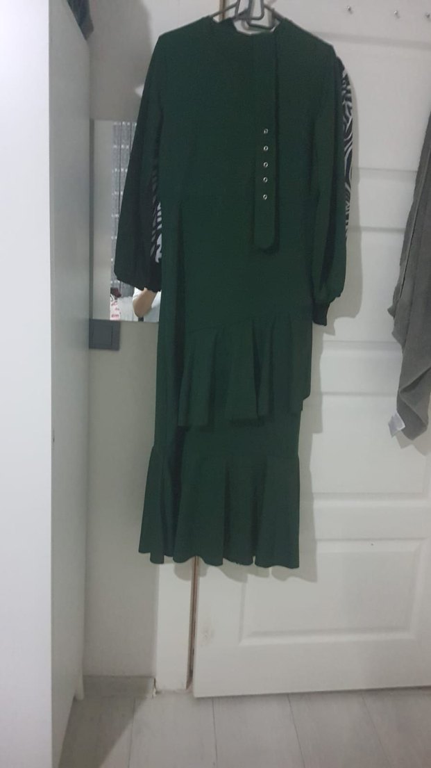 Koyu yeşil renkte, uzun kollu ve yakası kesimli uzun kadın elbisesi. Sentetik kumaştan, piliseli detaylara ve rahat kesime sahiptir.
