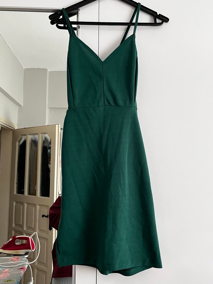Koyu yeşil renkte, V yakalı ve ip askılı, drapeli, minimalist tasarımlı, vücuda oturan midi elbise. Romantik gece için uygun.