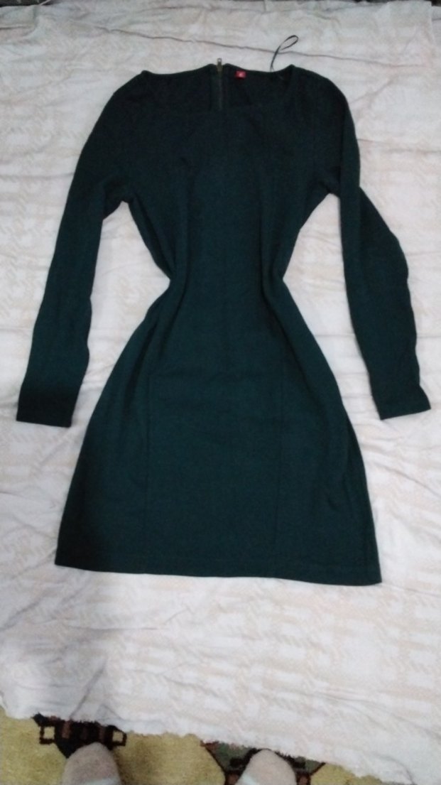 Koyu Yeşil V Yakalı Uzun Kollu Triko Elbise