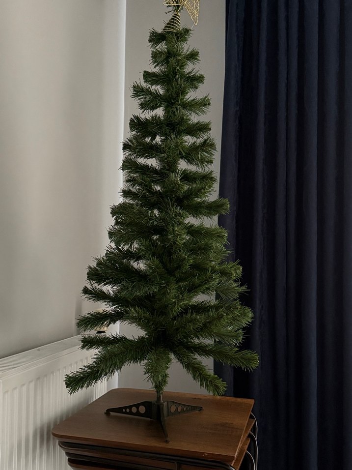 Koyu yeşil renkte yapay yılbaşı ağacı, sık dallı ve dayanıklı üç ayaklı tabanlıdır. 120 cm. eşim 180 cm ağaç aldığı için bunu satışa çıkardık. Hiç kullanılmadı, boyuna bakmak için açıp geri kutusuna kaldırdık.