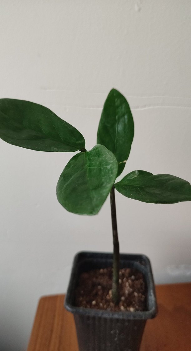 Koyu yeşil yapraklara sahip, siyah saksıda küçük bir ev bitkisi.