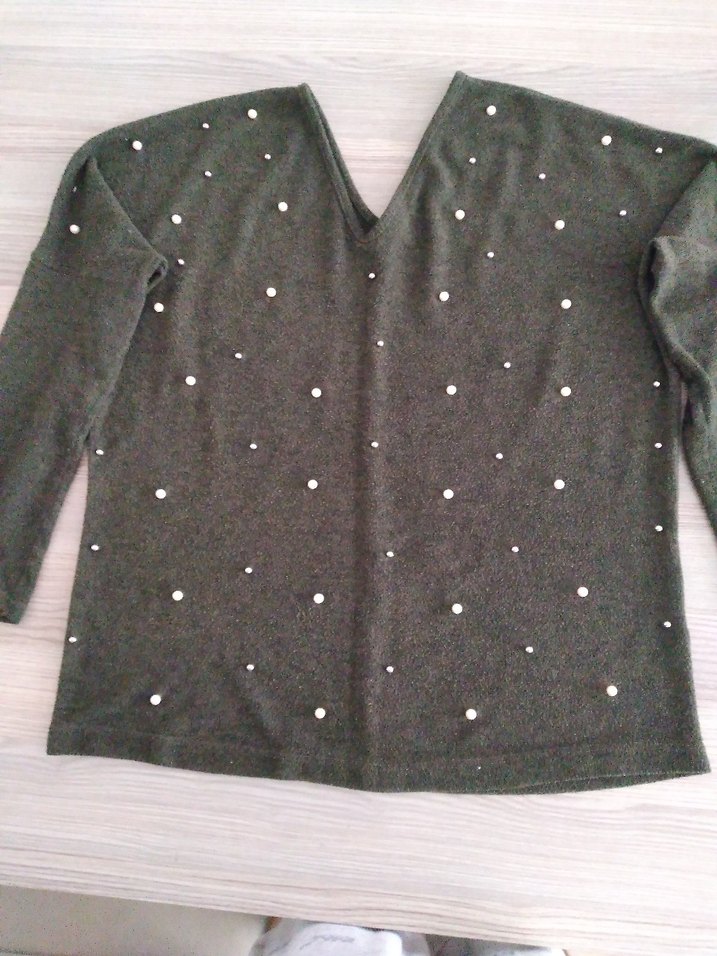 koyu yeşil renkli, V yaka ve uzun kollu örgü kazak. Bol kesimli ve normal midi boyda, taşlı veküçük noktalarla süslenmiştir. Rahat günlük kullanım için uygundur.