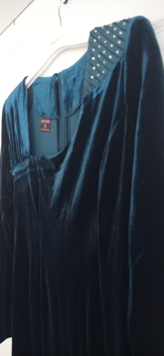 Koyu zümrüt, uzun kollu, yumuşak dokulu kadife abiye elbise. Çok zarif bacak dekoltelidir. Fotoğraf asıl rengi aktarmıyor, muhteşem bir renge sahiptir.