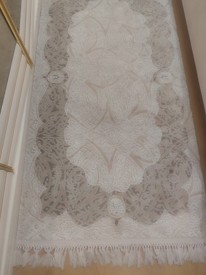 Beyaz ve gri tonlarda nakışlı desenli, püsküllü kenarları olan geleneksel halı. Her odaya zarif bir dokunuş katar. ürün temiz kullanılmış