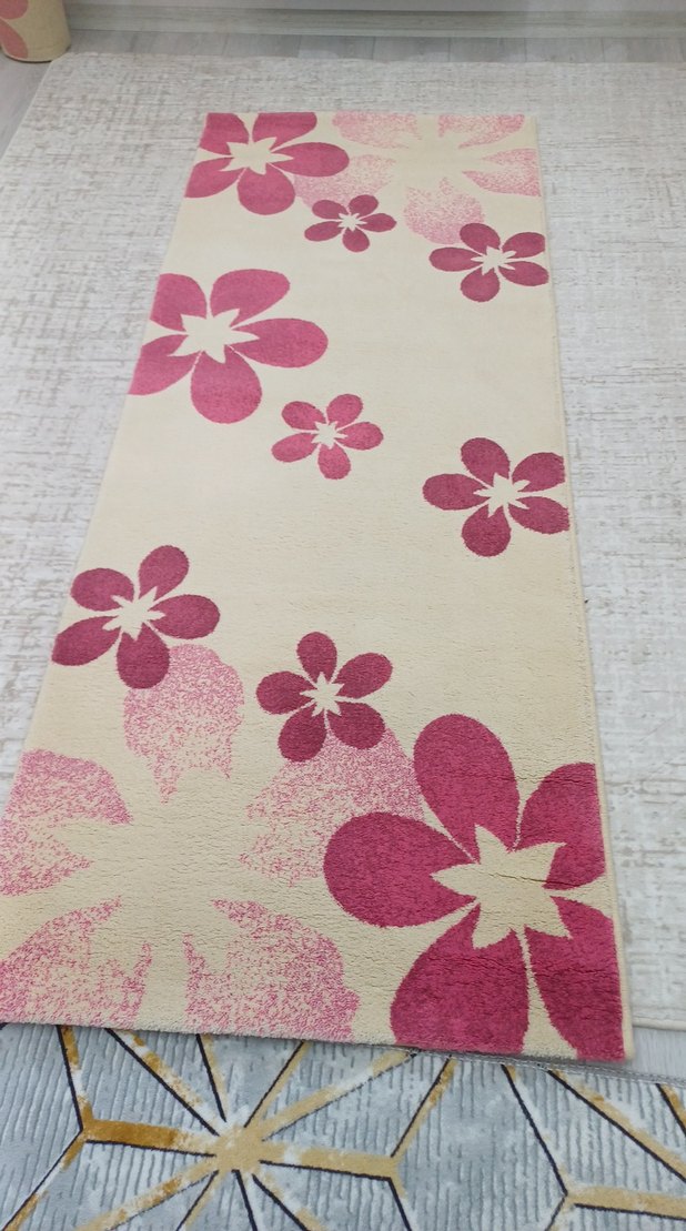 Pembe çiçek desenleriyle renkli, klasik tarzda bir halı. üç parça yatak odasi halisi en 80 cm boy 200 cm 2 metredir