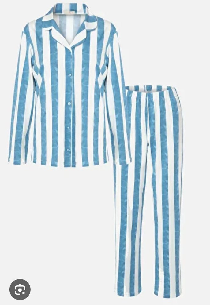 XL/2XL bedenler mevcuttur. Kadınlar için mavi beyaz dikey çizgili, uzun kollu ve normal boy midi pijama takımı. Paris sokak modası tarzında rahat kesim.