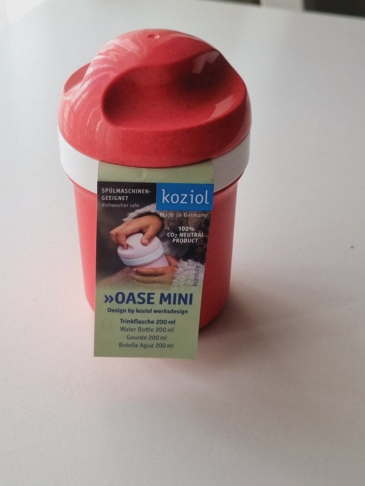 Koziol Oase Mini, 200 ml renkli çocuk su şişesi. Almanya'da üretilmiş, bulaşık makinesinde yıkanabilir ve çevre dostudur.