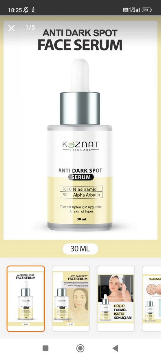 KOZNAT Leke Karşıtı Serum, %10 Niasinamid ve %1 Alpha Arbutin içerir. Tüm cilt tipleri için uygundur. 30 ml şişede sunulur. 3 ürün birden satılık trendi yoldan tayyar öz imzalı orjinaldir benim çocuktan kullanmaya fırsatım olmuyor gerçekten ürünler süper ihtiyaçtan satıyorum aldığım fiyatın altına iki kere kullanıldı sadece