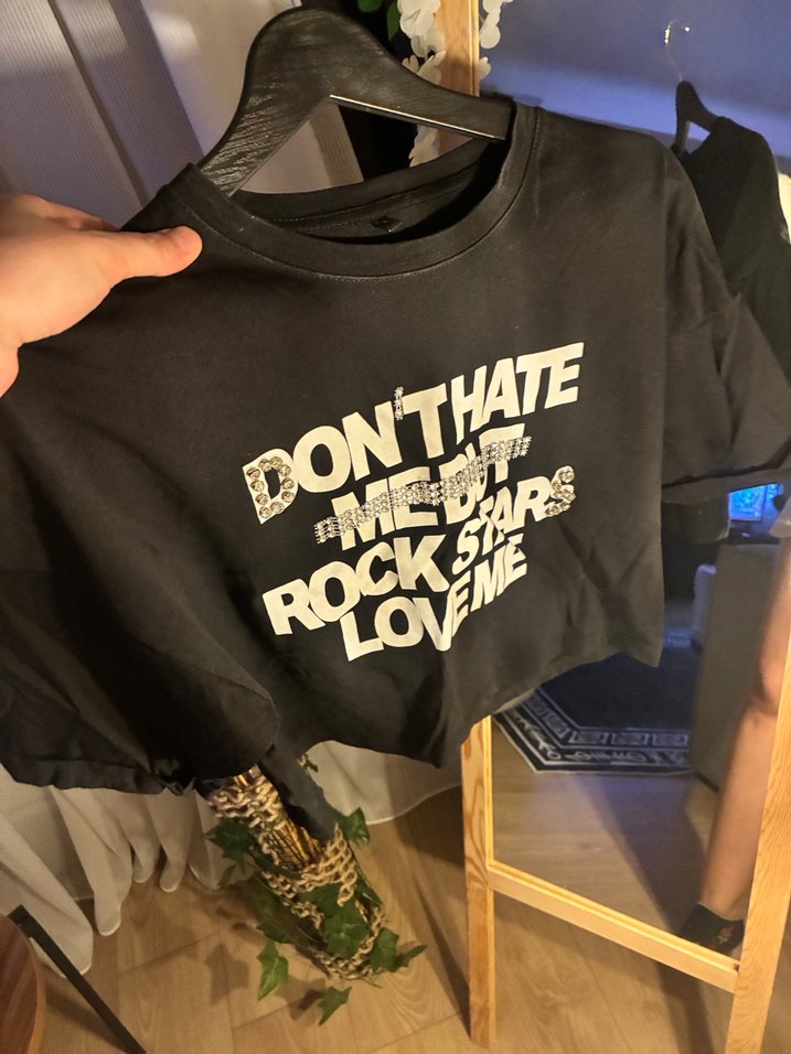 Kızlar için bol kesim, yuvarlak yaka ve kısa kollu siyah tişört. Rock punk baskılı slogan ve payet detayları, yumuşak denim kumaşla birleşiyor.
