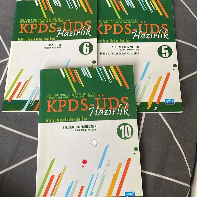 KPDS-ÜDS sınavlarına hazırlık için okuduğunu anlama, cümle tamamlama ve boşluk doldurma alıştırmaları içeren kitap seti. Her birinin sadece birkaç sayfası doludur. Hepsinin fiyatı
