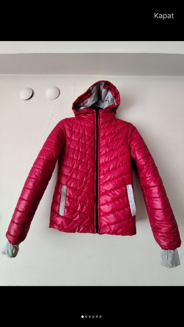 Kırmızı, kapüşonlu ve fermuarlı kadın kışlık ceket. Sentetik kumaştan, yüksek yakalı ve uzun kollu, günlük sokak tarzı için uygundur. Sayili kullanilmis Temiz ve sikintisiz. ❄️