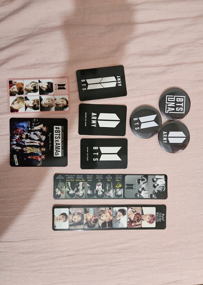 Ünlü kpop grubu BTS baskılı rozetler tek kaldı. Kartlar, kitap ayraçları, bardak altlığı elimde çokça bulunmakta. Hepsinin ayrı ayrı olarak da satışı mevcuttur. Fotoğraftakilerin hepsine toplu olarak fiyat biçilmiştir. Kartlar ve bardak altlığı dediklerim ince karton gibidir tercihe bağlı kullanım ben kare olanı altlık olarak kullanıyorum o yüzden.