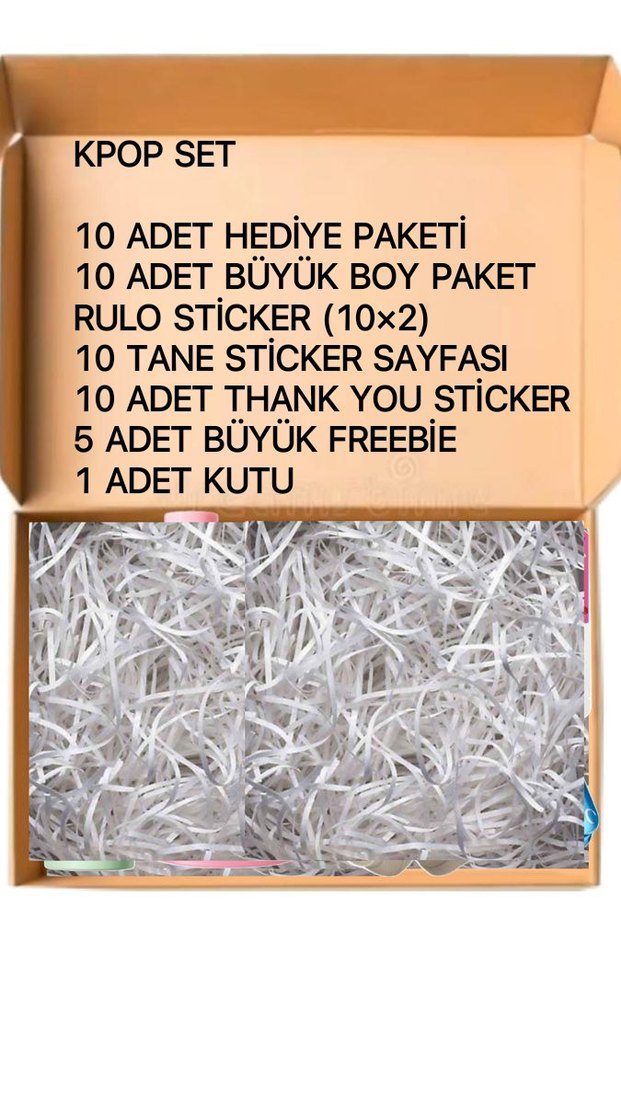 KPOP set içinde 10 hediye paketi, 10 büyük paket, rulo stickerlar, 10 sticker sayfası, 10 thank you sticker, 5 büyük freebie ve 1 kutu bulunur. bu ilanı almayın ilan açtırın