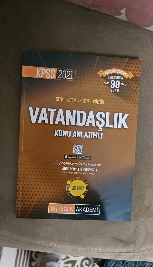KPSS 2021 Vatandaşlık konularını anlatan, 120 soruda 99 soru içeren, Pegem Akademi video dersleri sunan hazırlık kitabı.