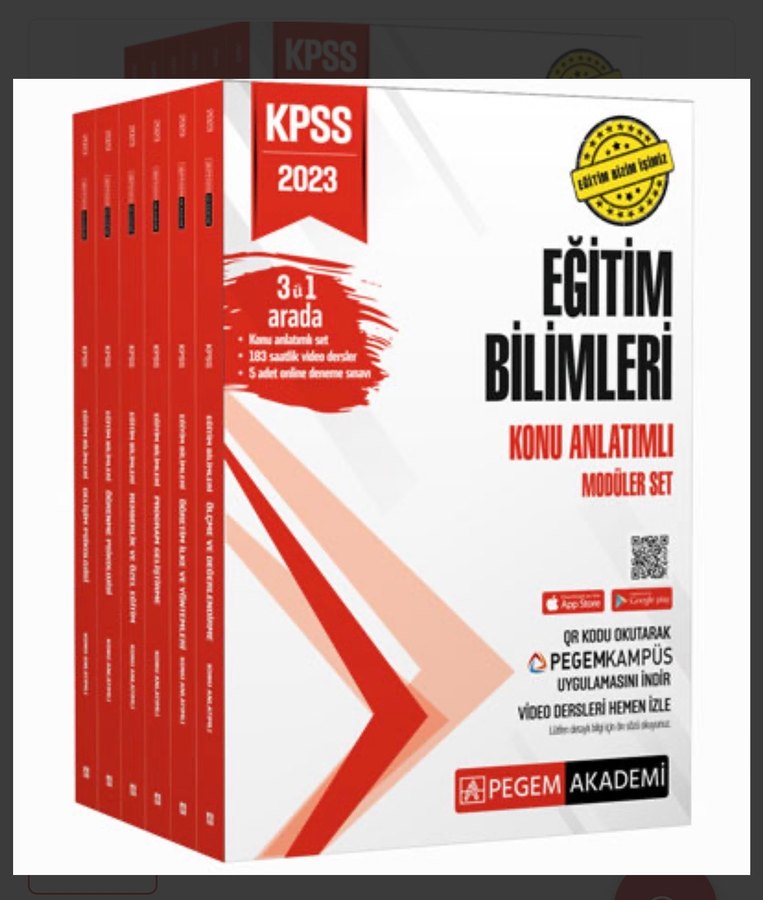 Hiç kullanılmadı yenidir KPSS 2023 Eğitim Bilimleri modüler set, konu anlatımlı, 180 saat video ders ve 5 tam deneme sınavı içerir. QR kodla PegemKampus uygulamasından derslere erişim sağlar.