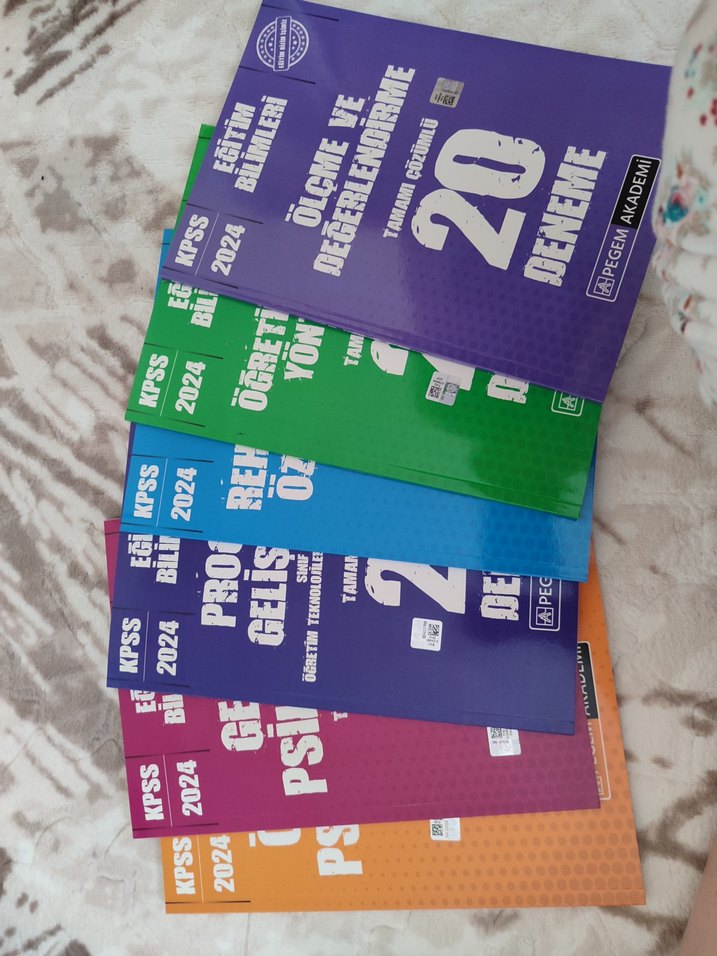 KPSS 2024 Eğitim Bilimleri alanında ölçme, değerlendirme, öğretim yöntemleri ve psikoloji konularını içeren deneme kitapları seti.