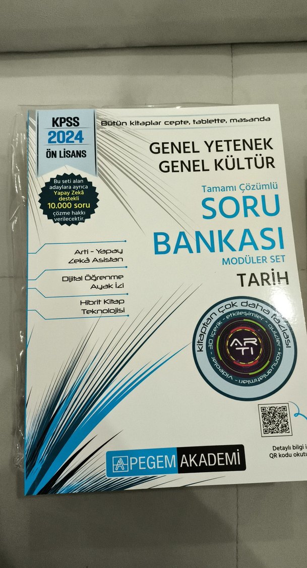 KPSS 2024 Ön Lisans Genel Yetenek ve Genel Kültür konularını tam çözümlü sorularla içeren modüler set. Tarih odaklı, dijital öğrenme, hibrit kitap teknolojisi ve yapay zeka desteği bulunur. QR kod ile detaylı bilgi erişimi sağlar.