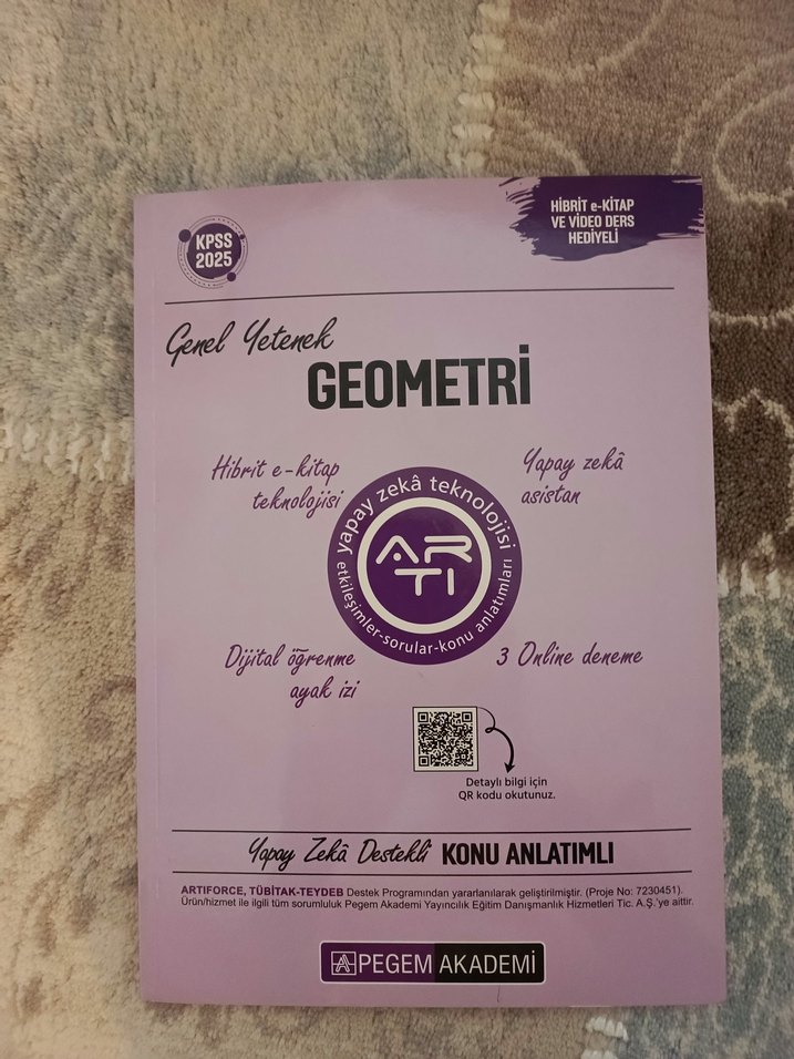 KPSS 2025 Genel Yetenek Geometri kitabı hibrit e-kitap teknolojisi, yapay zeka asistanı, dijital öğrenme uygulaması ve 3 online deneme içerir.