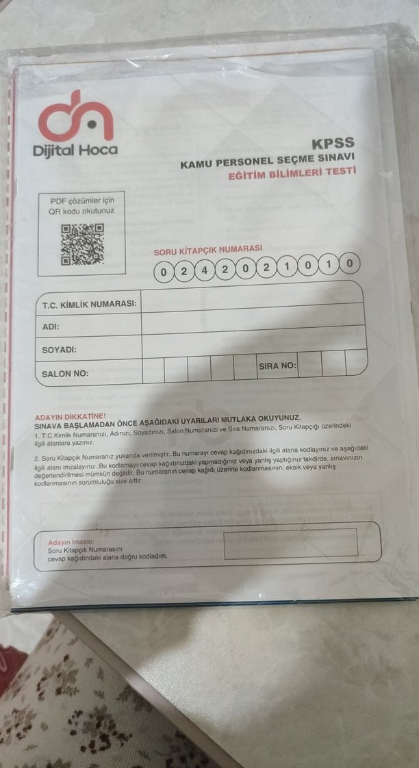 KPSS Eğitim Bilimleri testi soru kitapçığı, aday bilgileri alanları ve PDF çözümleri için QR kodu içerir. Sınav uyarıları ve talimatlar mevcuttur. İÇİNDE 5 TANE VAR