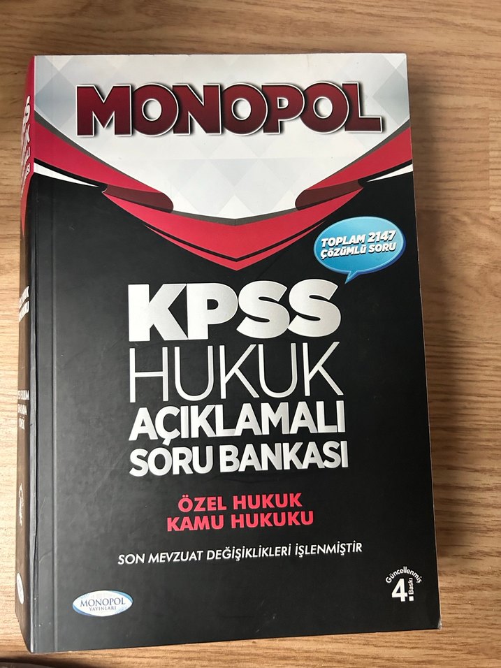 Monopol KPSS Hukuk Açıklamalı Soru Bankası, özel ve kamu hukuku konularında son mevzuat değişiklikleri işlenmiş ve toplam 2147 çözümlü soru içerir. 4.baskı. Kullanılmadı.