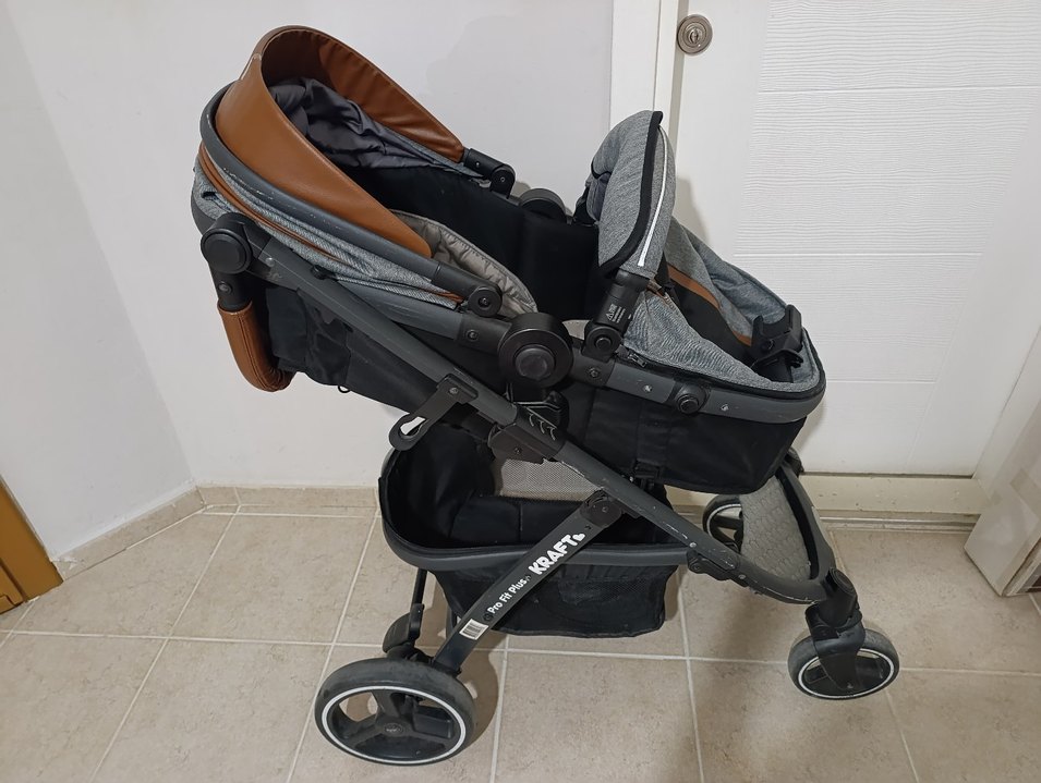 Gri ve kahverengi Kraft bebek arabası, sağlam iskelet ve çocuk için konforlu oturma alanı sunar. Depolama sepeti ve kolay hareket eden tekerlekler bulunur. puseti de var yalnız üst şemsiye kısmı kırık o yüzden sadece araba fiyatı olarak yansıtıyorum. isteyene puseti de gönderirim. güncel fıyatı 15 binden fazla.