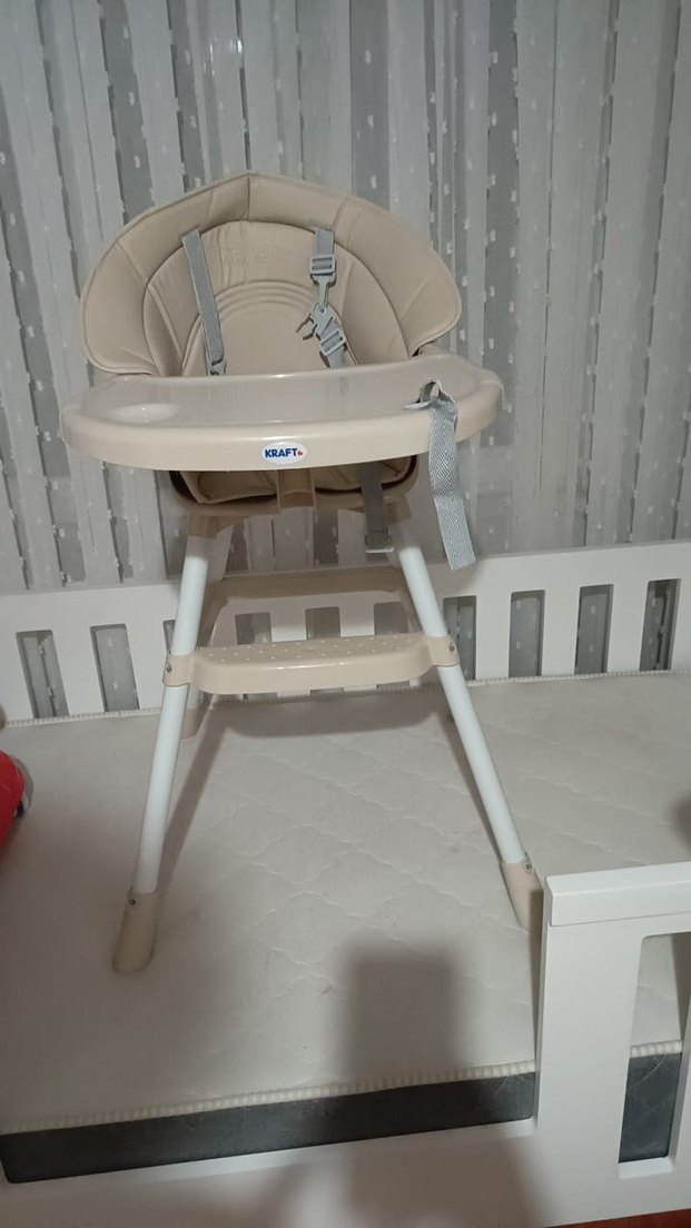 Kraft bej renkli mama sandalyesi, güvenlik kemerleri ve çıkarılabilir tepsiye sahiptir. Beyaz sağlam ayaklı ve ayak dayama yerli.