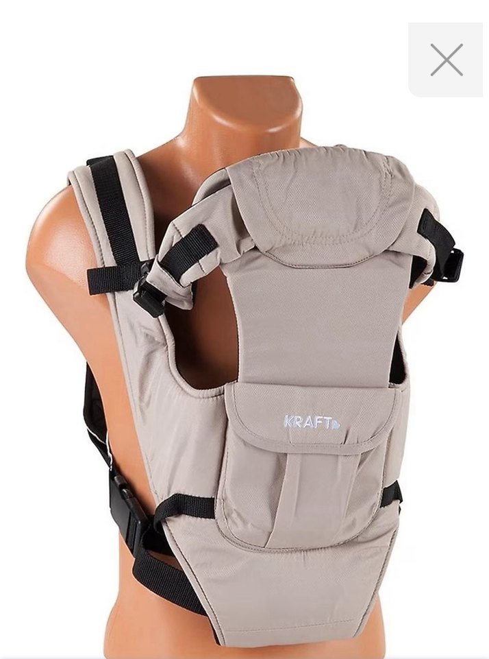 KRAFT marka bej bebek taşıyıcı, ayarlanabilir askılar ve yumuşak kumaş ile konfor sağlar. Önünde küçük cep ve güvenli tokalar bulunur.