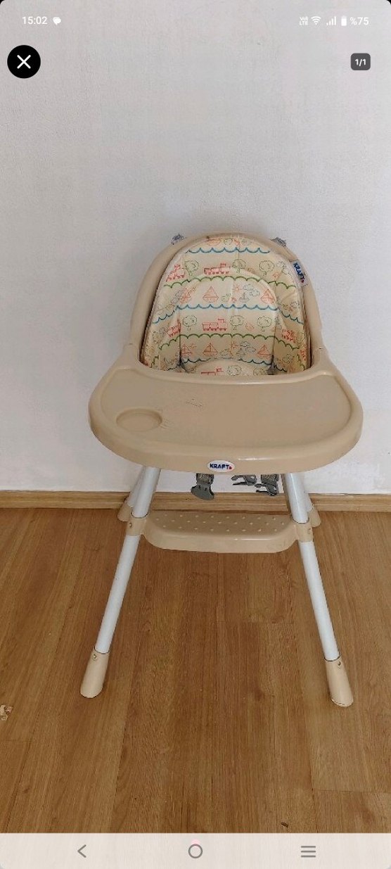 Kraft mama sandalyesi, pastel bej renk ve desenli oturma minderi ile birlikte gelir. Kolay temizlenebilir tepsi, ayak dayama yeri ve sağlam ayaklara sahiptir.