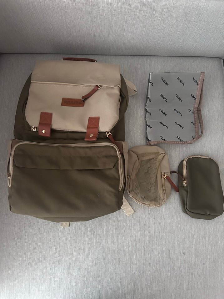 Çok bölmeli, bej ve haki renklerde bebek bakım çantası seti. İçinde küçük çantalar ve açılır alt değiştirme minderi bulunur. Çok temiz durumdadır.