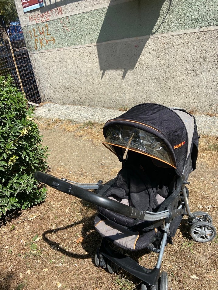 tüm aksamları sağlam. titiz kullanılmış sorunsuz. ister oturma pozisyonlarında ister yatak pozisyonunda kullnabilirsiniz. ittirme mekanizması iki tarafa da çevrilebiliyor Siyah ve gri renkte bebek arabası, şeffaf pencere ve koruyucu tenteye sahiptir. Rahat itme için yastıklı tutma kolu ve dayanıklı tekerlekleri bulunur.