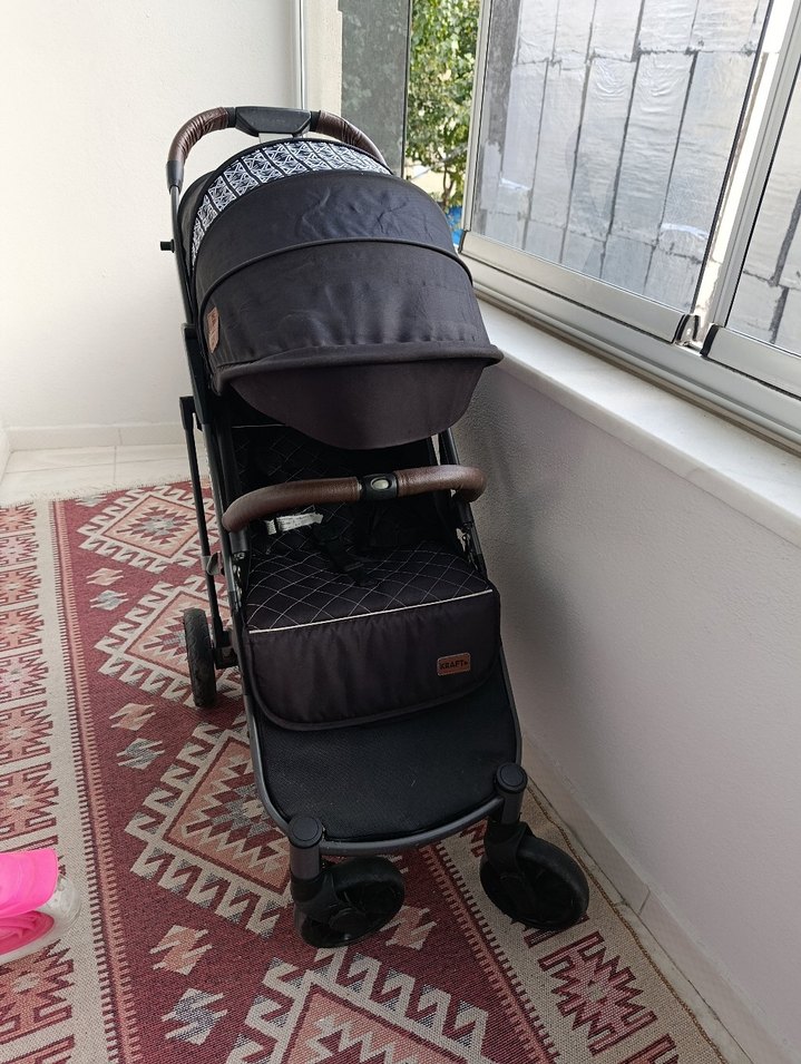 Koruma barındaki tuş kırık onsuz da sorunsuz kullanılıyor, emniyet kemerleri sağlam. Katlanabilir yapıda siyah bebek arabası, koruyucu tente ve konforlu yastıklı oturma alanına sahiptir. Sağlam tekerlekleriyle kolay hareket sağlar.