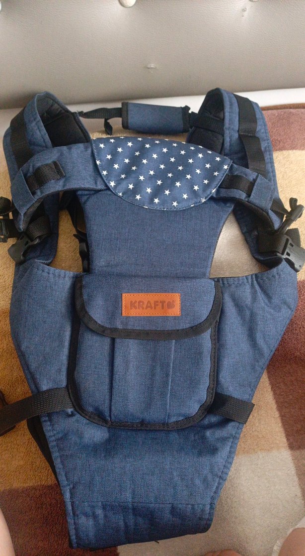 Kraft marka koyu mavi bebek taşıyıcı, ayarlanabilir askılar ve yıldız desenli yumuşak kumaş ile konfor sağlar.