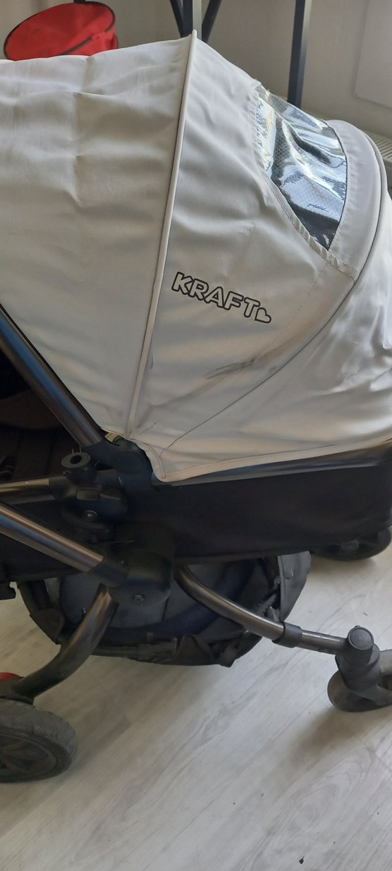 Kraft bebek arabası, minimalist tasarımlı, kemerli güvenlik sistemine sahip. kullanilmis üründür. deforme yoktur 2 parça halindedir.360 derece döner çift yönlü yagmurluk mevcuttur